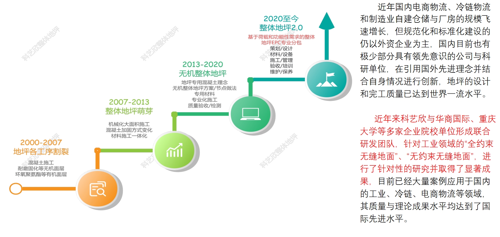 科艺欣极度重视员工的成长和培训,多次派遣管理层和核心技术员工前往英国斯坦福公司的项目进行学习交流,并与比利时Twintec公司形成了战略合作。通过对国外优秀地坪企业的管理、质量、设计、验算、施工、过程管控、施工机械运用等方面的研究;学习;借鉴,并结合国内地坪行业的实际情况,采用引进、融合、创新的手段,建立了科艺欣独有的地坪工程设计、施工工法与管理体系,且目前已经大量应用于国内的军工、航空、医药、食品、电子、工业、商业、住宅等等各大领域,为用户提供全球领先的专业整体地坪解决方案。