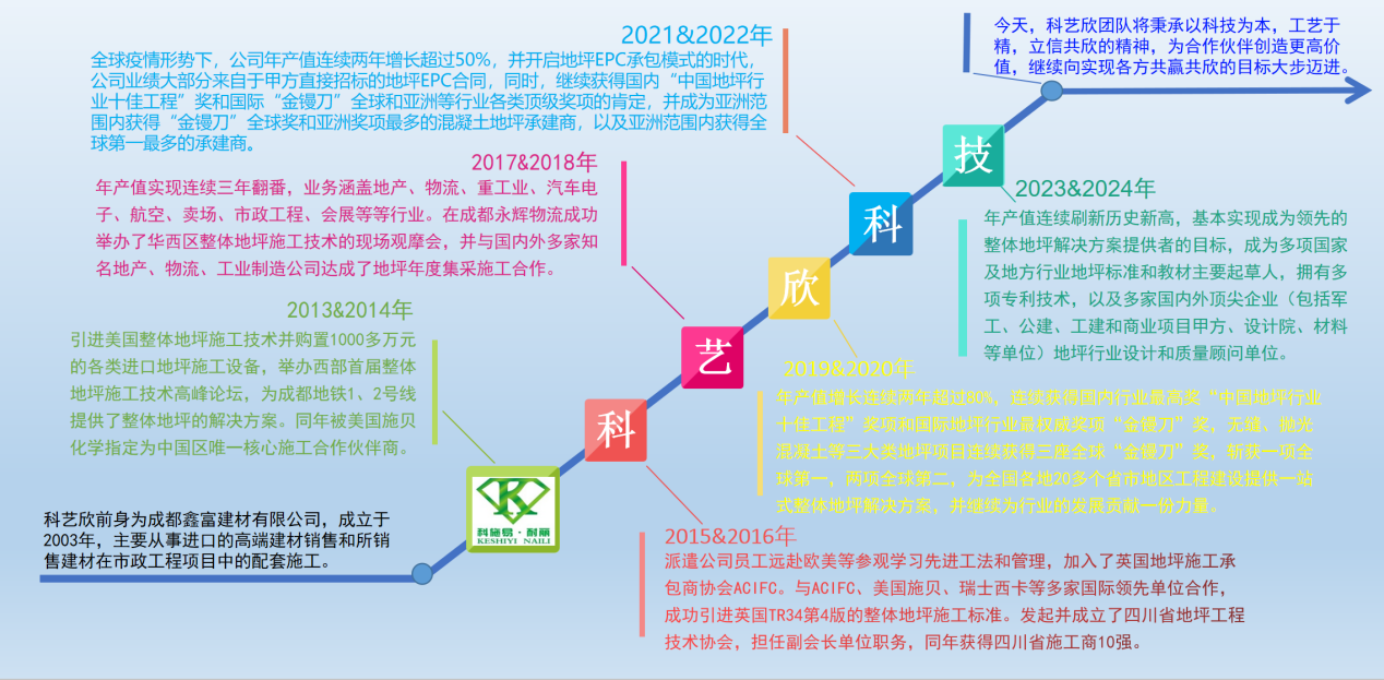 成都科艺欣科技有限公司(以下简称“科艺欣”)是一家是拥有超过15年专业施工经验的整体地坪解决方案提供商,多年来始终致力于将国外先进的施工理论与管理理念、科技、材料与国内实际结合,秉承工匠精神,从施工质量、日常生产作业效率、后期地坪维护成本等用户所关注的角度出发,创造性提出整体地坪解决方案,切实提供一系列完善的高质量服务。