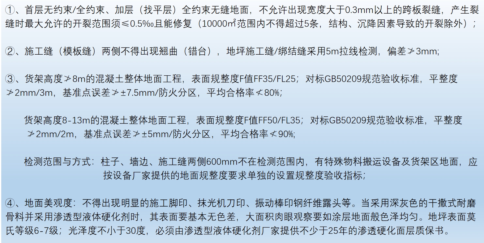 | 混凝土硬化整体地坪 | 采用液态硬化剂施工而成的整体混凝土地坪地面(分混凝土原浆硬化和耐磨硬化两种) | 0VOC环保、A1级防火、与建筑物同寿命、维护成本最低且后期无维修成本 | 装饰性较难满足,呈现颜色种类受限,且不耐酸碱溶液 | 普通厂房、仓储,无装饰要求的展厅、停车场等 |